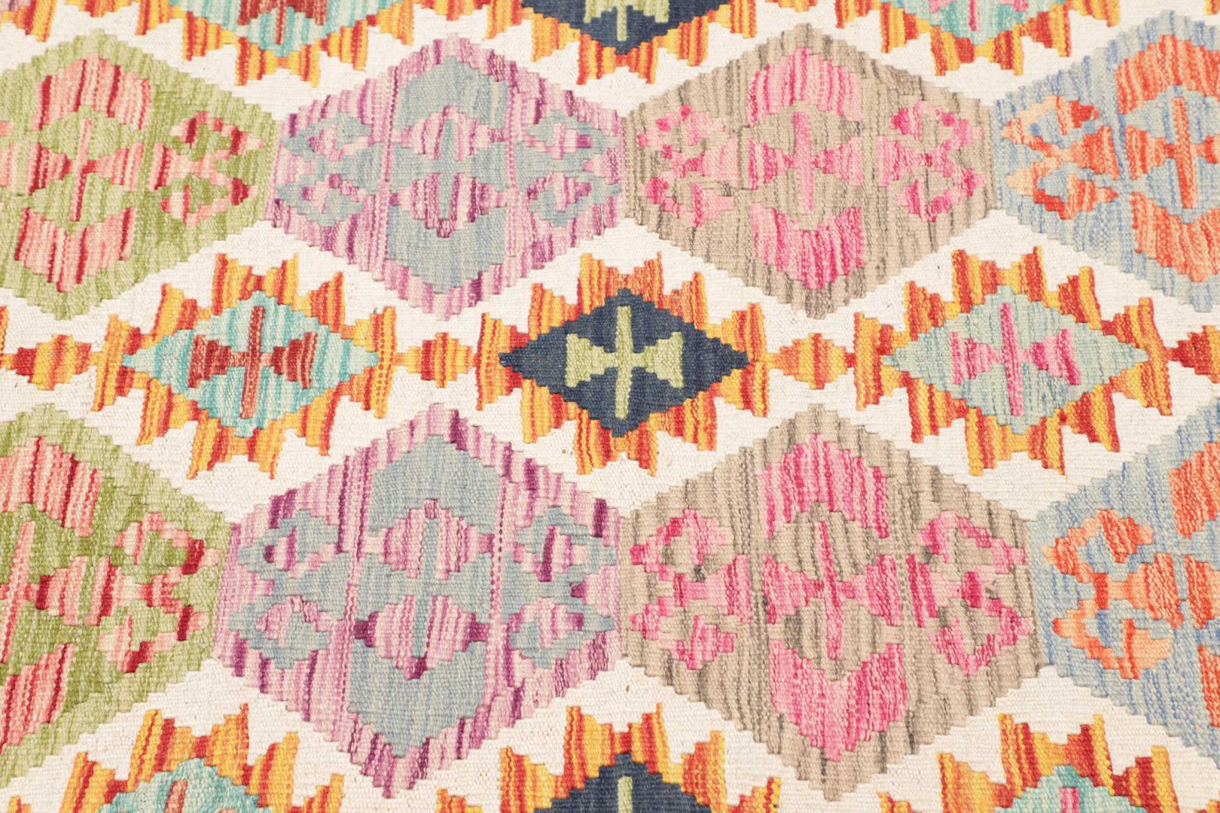Acest kilim afgan țesut manual este frumos datorită culorilor multiple și modelului tipic. A fost țesut manual în Afganistan din 100% lână de oaie. Este, fără îndoială, mai robust și mai durabil decât covoarele fabricate la mașină. În plus, acest kilim are propriul său caracter. O piesă unică pentru tine și casa ta pe care nu o vei mai găsi niciodată.