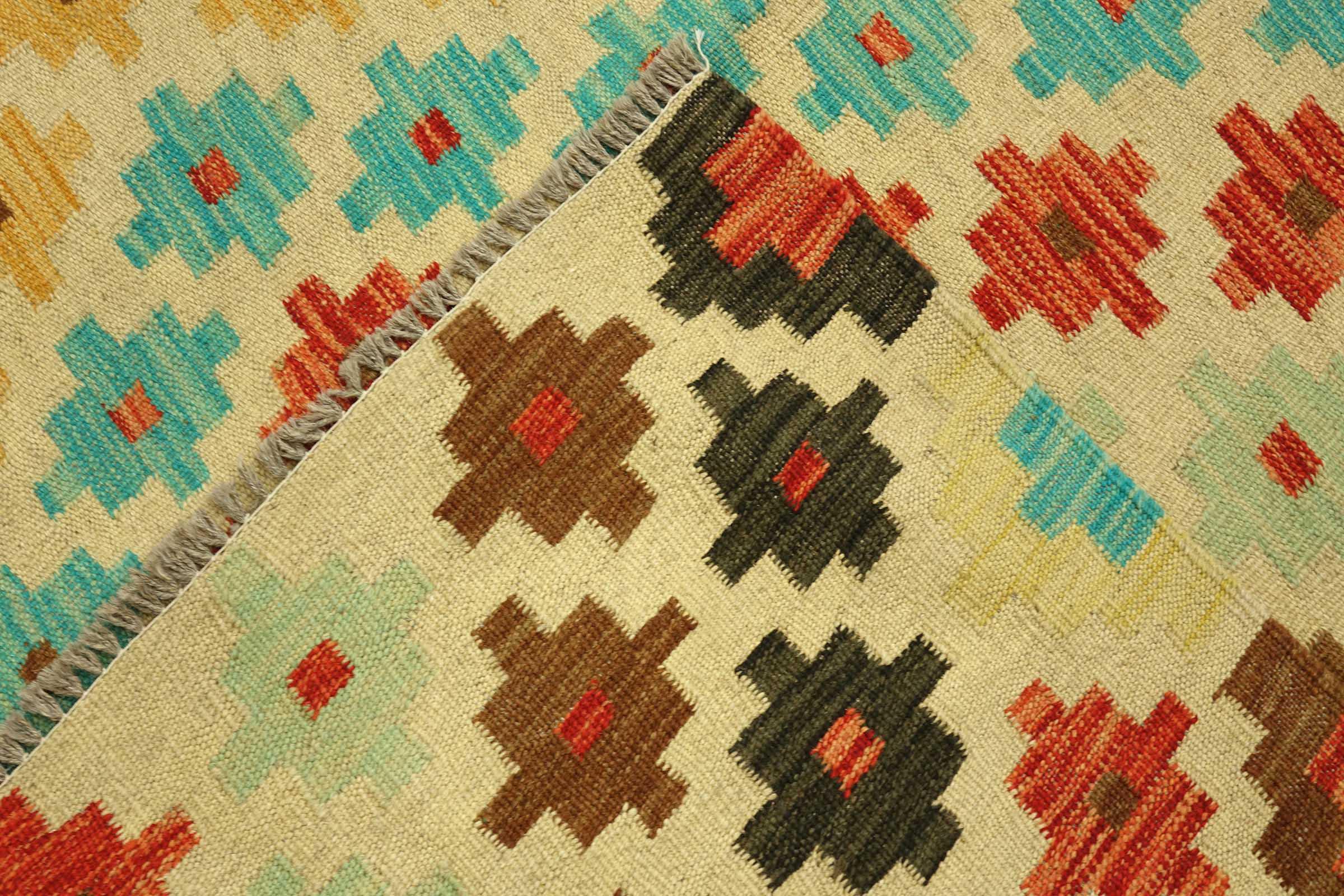 Acest kilim afgan țesut manual este frumos datorită culorilor multiple și modelului tipic. A fost țesut manual în Afganistan din 100% lână de oaie. Este, fără îndoială, mai robust și mai durabil decât covoarele fabricate la mașină. În plus, acest kilim are propriul său caracter. O piesă unică pentru tine și casa ta pe care nu o vei mai găsi niciodată.