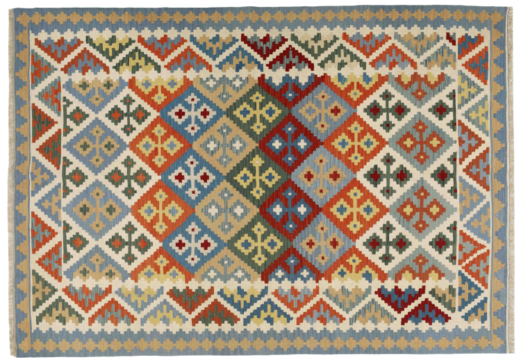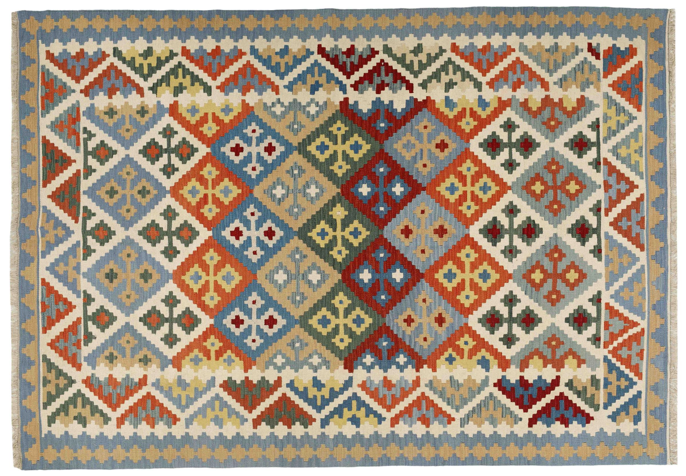 Acest Chilim fars țesut manual combină modelele și ornamentele persane cu tradiția țesăturilor plate. O combinație grozavă și modernă a celor mai populare concepte ale Orientului. Acest lucru creează un covor cu o gamă largă de utilizări. Fie ca o cuvertura de pat, fie ca un covor in fata canapelei – un kilim Fars face posibil acest lucru si poate fi gasit acum in cele mai cunoscute reviste de design interior. Covoarele Kilim Fars sunt țesute manual în Iran și, prin urmare, se numără printre kilimurile de cea mai înaltă calitate.