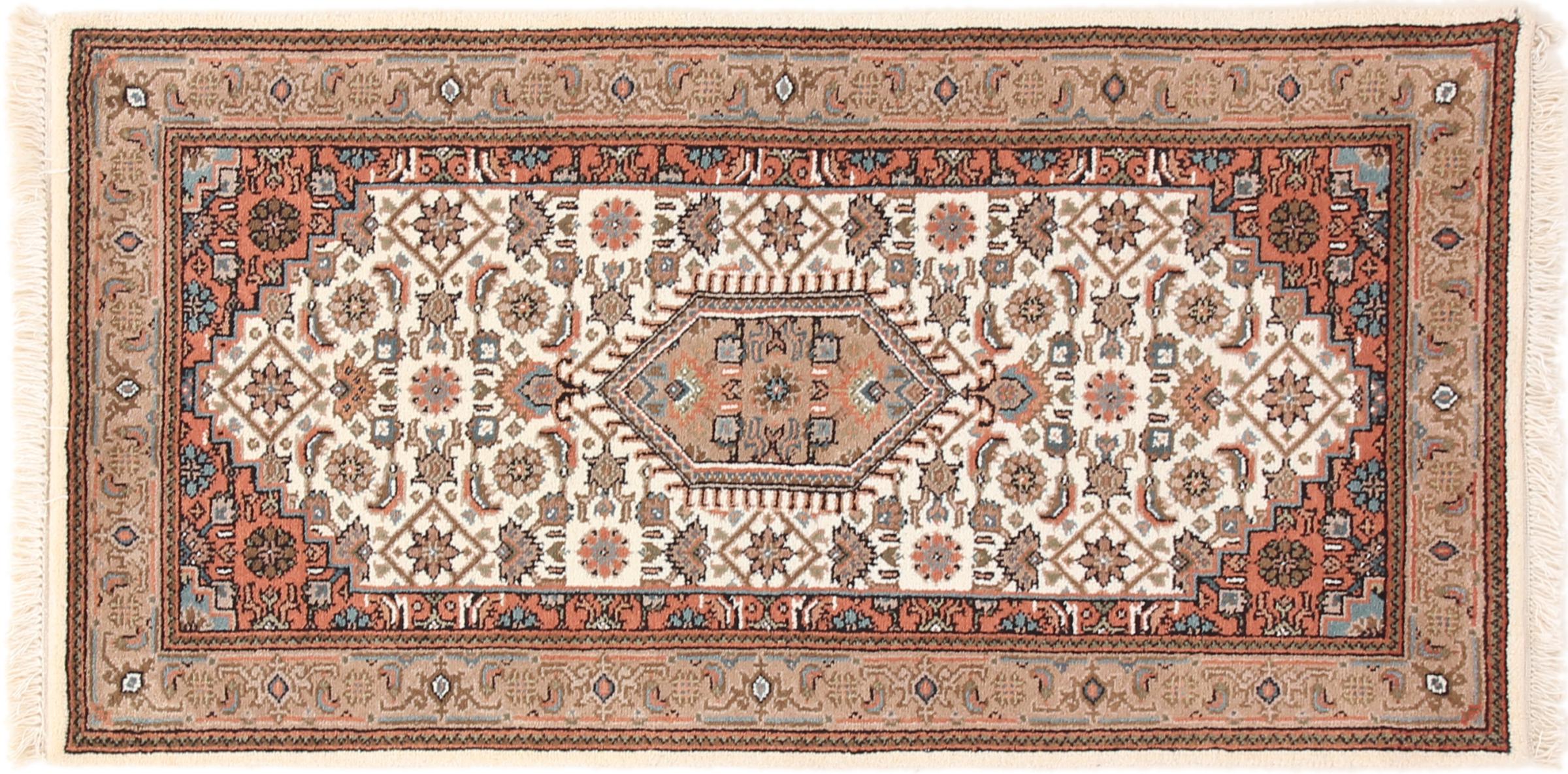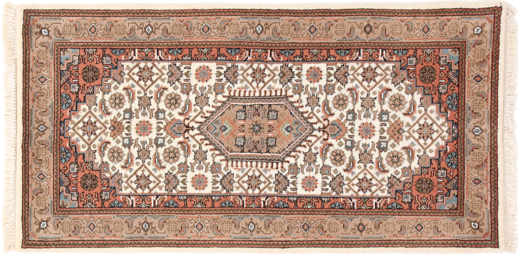 Covor Nr.: 197916005864233 Mărime: 141x71 cm Grosime: cca. 12 mm Noduri: 72 000 - 90 000 / m² Prelucrare: Lucrate de mână Catifeaua: Lână toarsă manual Urzeala: Bumbac Origine: India Vechime: Nou Greutate: cca. 4 kg În stoc: Unic - Doar 1 în stoc