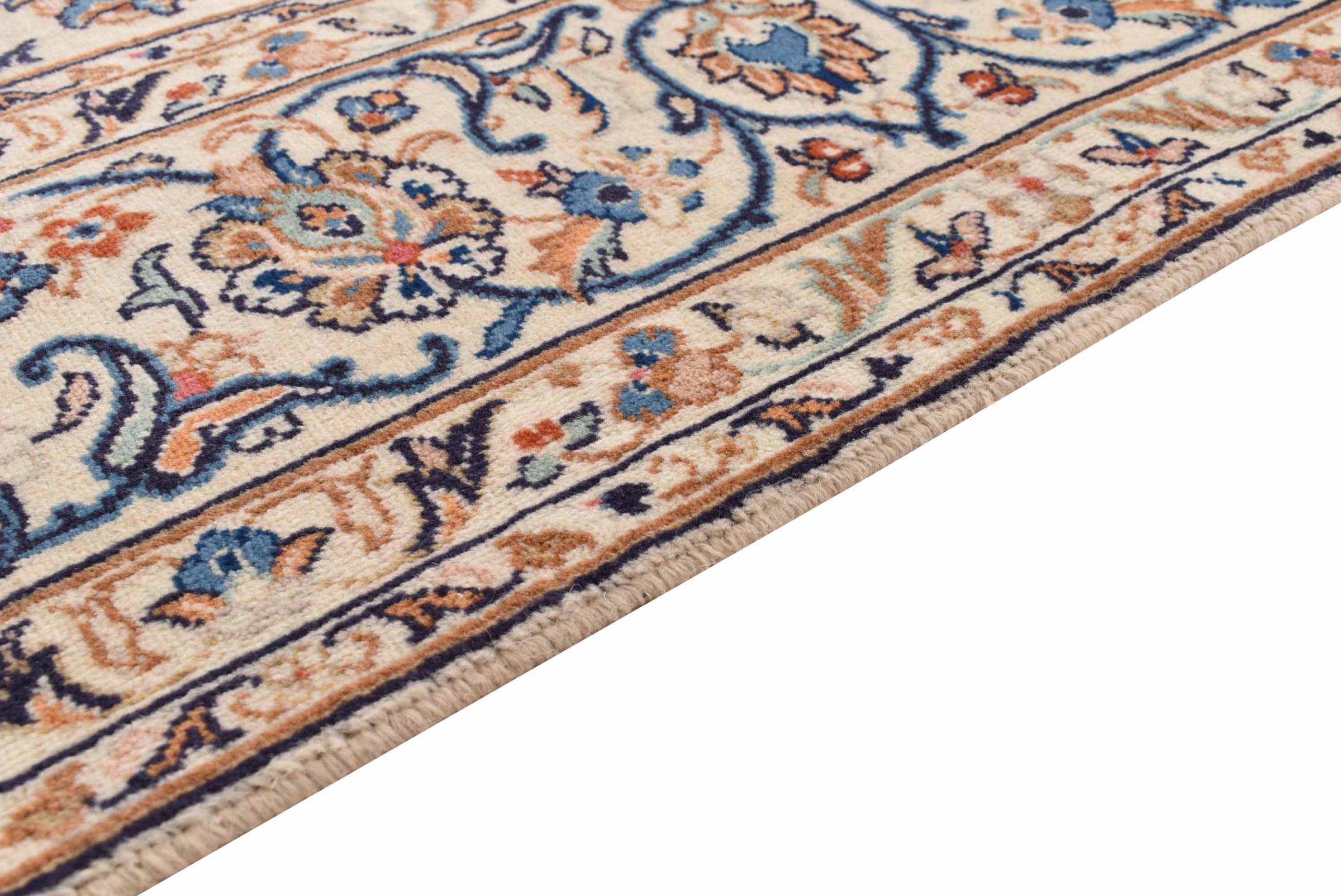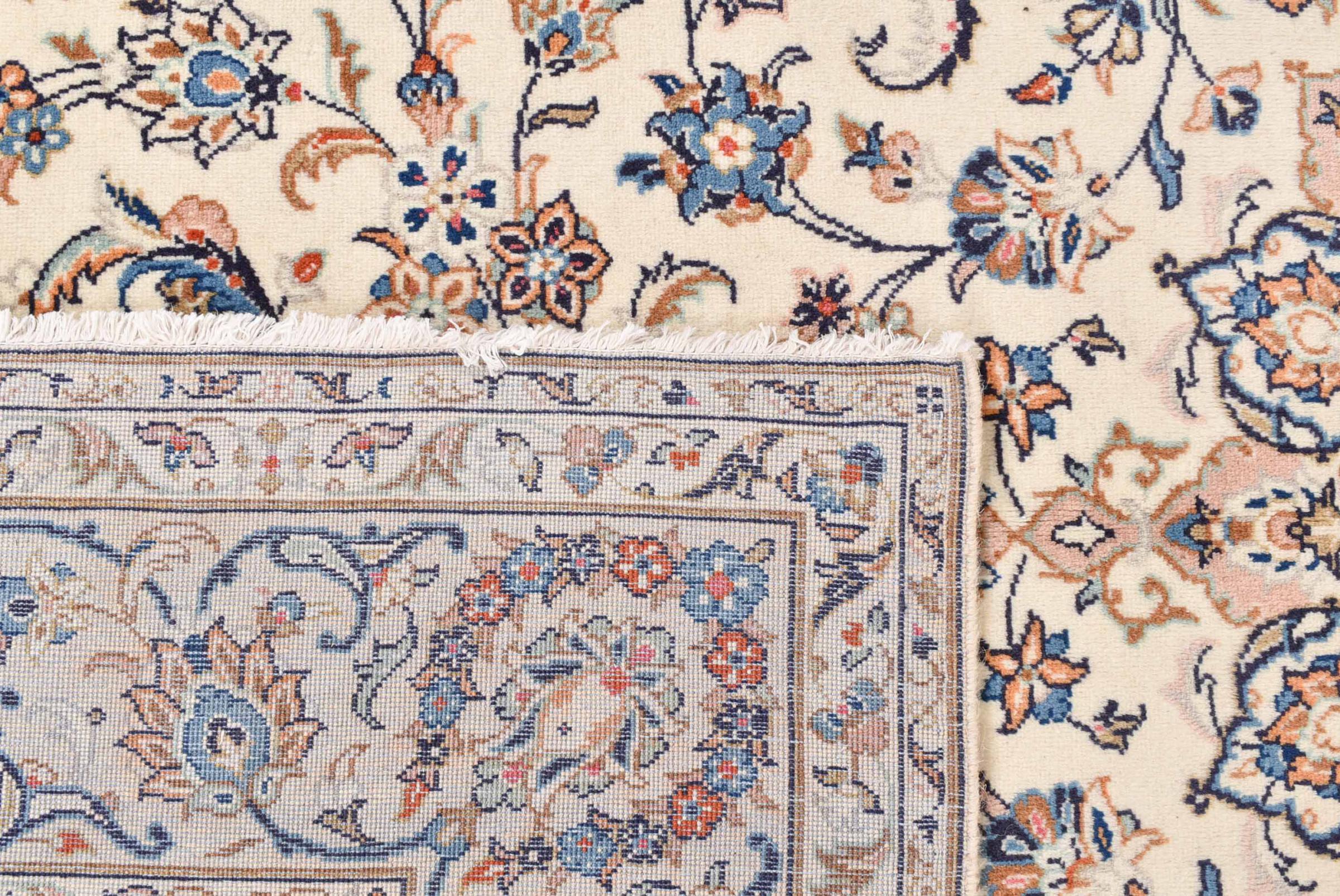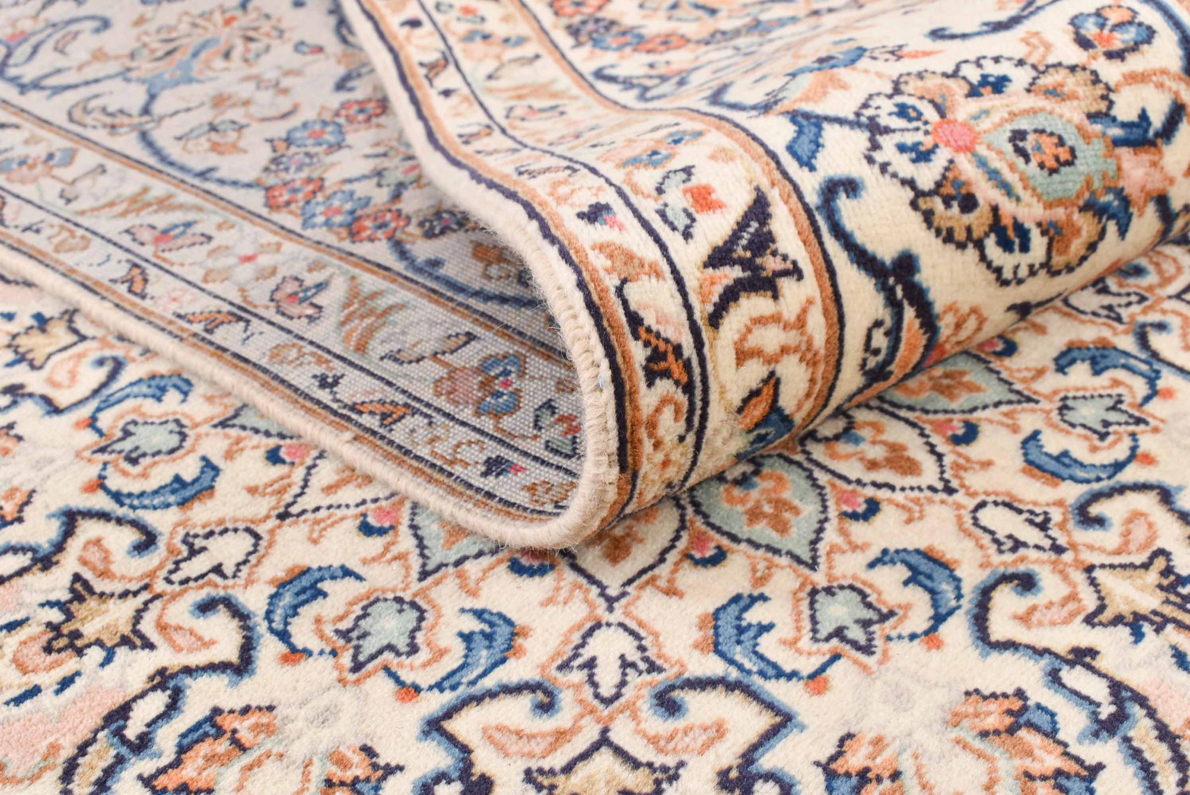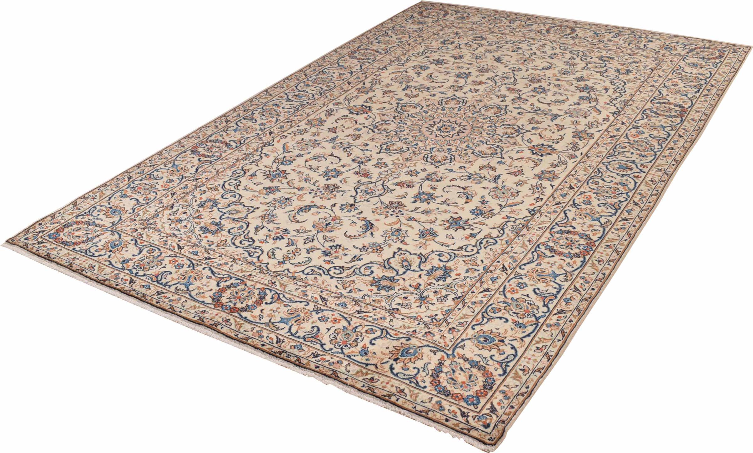 Acest covor de la Kashan (Keshan) este ținut în designul său foarte tradițional și tipic persan, cu ornamente frumoase. Covoarele Kashan sunt foarte populare datorită designului lor excepțional de elegant. Aceste covoare provin din Kashan, un oraș de pe anticul Drum al Mătăsii. Acest covor a fost înnodat manual din lână de oaie de calitate superioară și va fi un punct culminant unic în casa dvs.