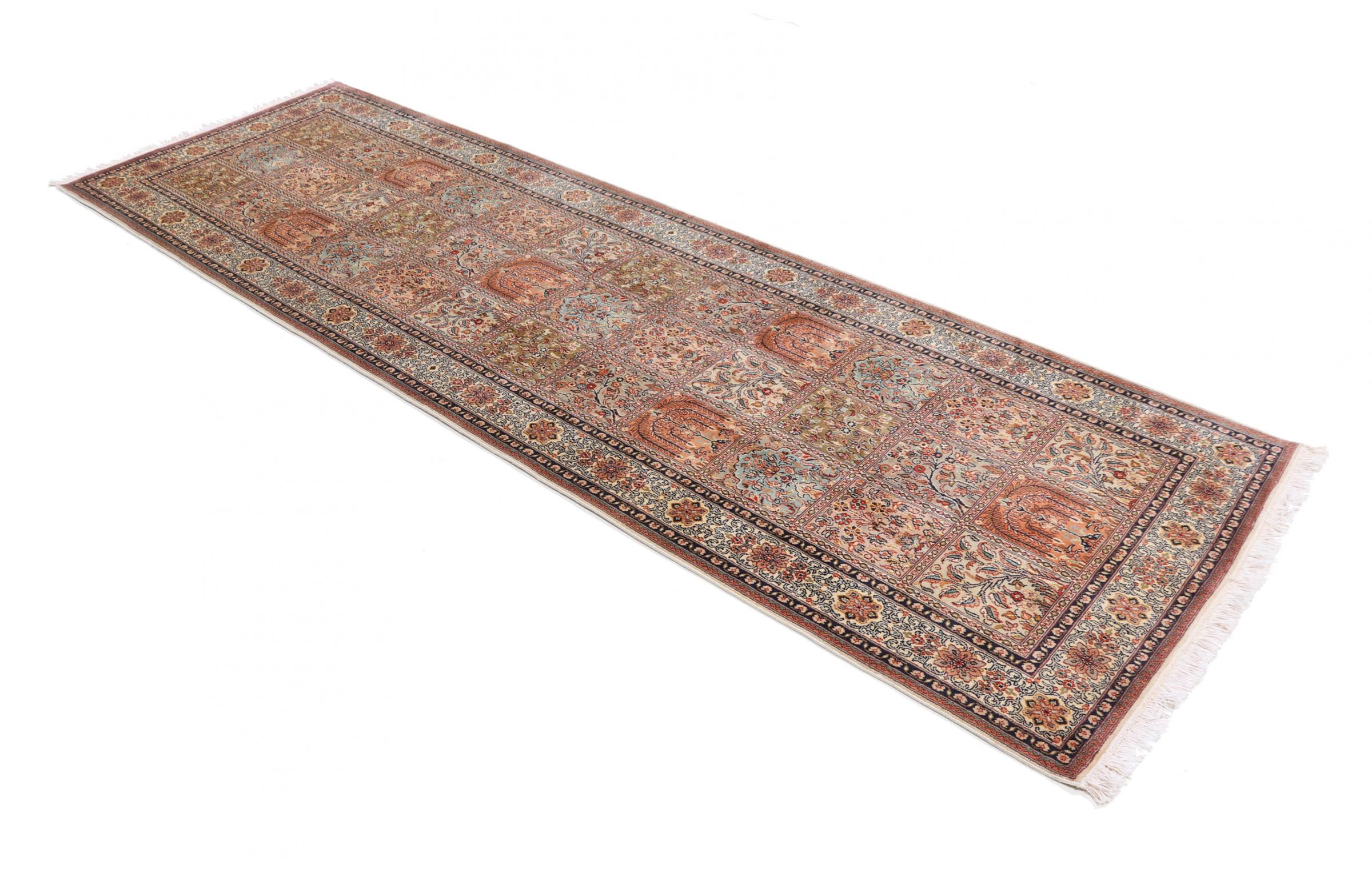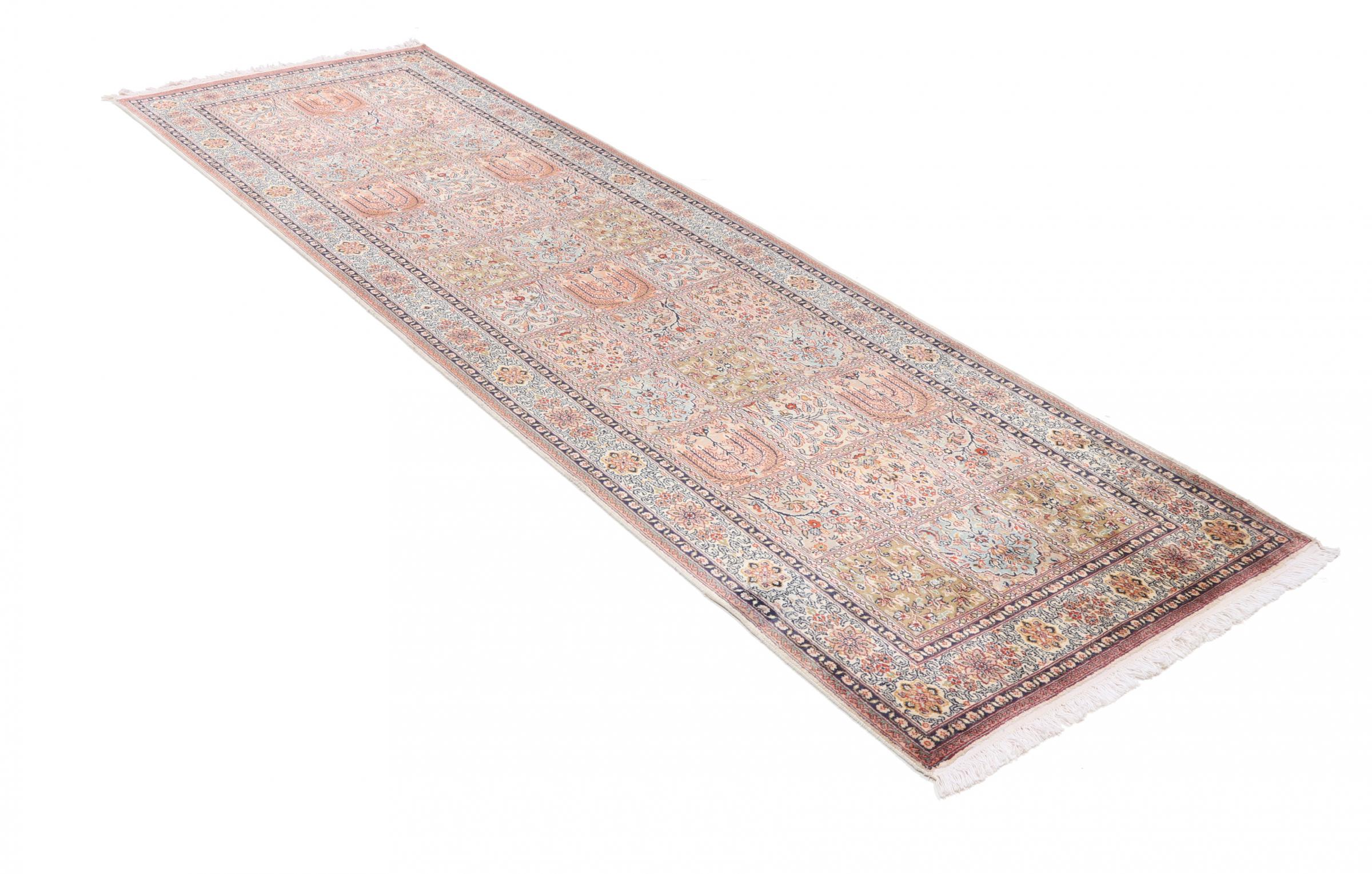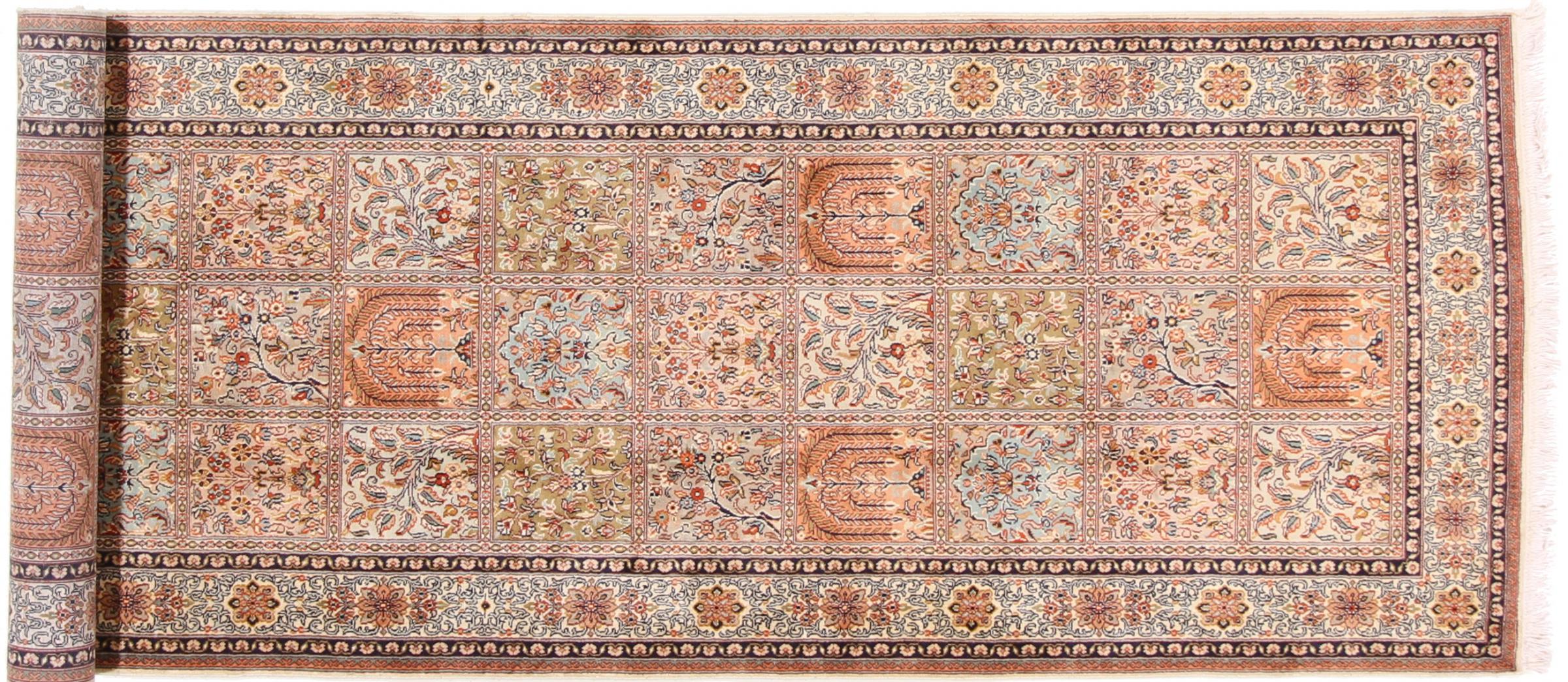 Covor Nr.: 108742006291087 Mărime: 306x96 cm Grosime: cca. 4 mm Noduri: 450 000 - 500 000 / m² Prelucrare: Lucrate de mână Catifeaua: Mătase Urzeala: Bumbac Origine: India Vechime: Nou Greutate: cca. 6 kg În stoc: Unic - Doar 1 în stoc