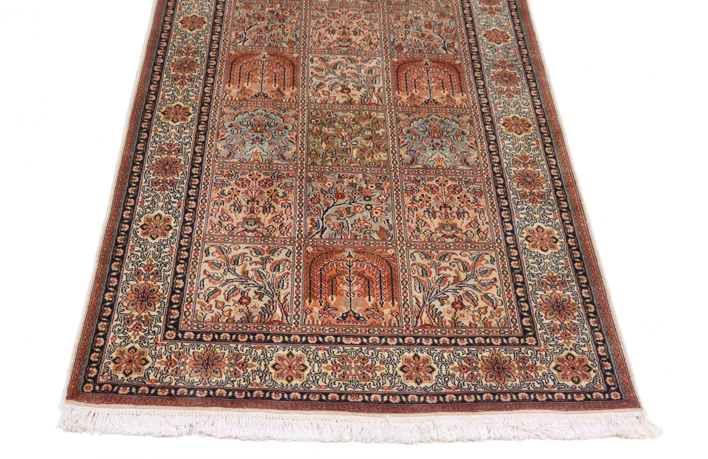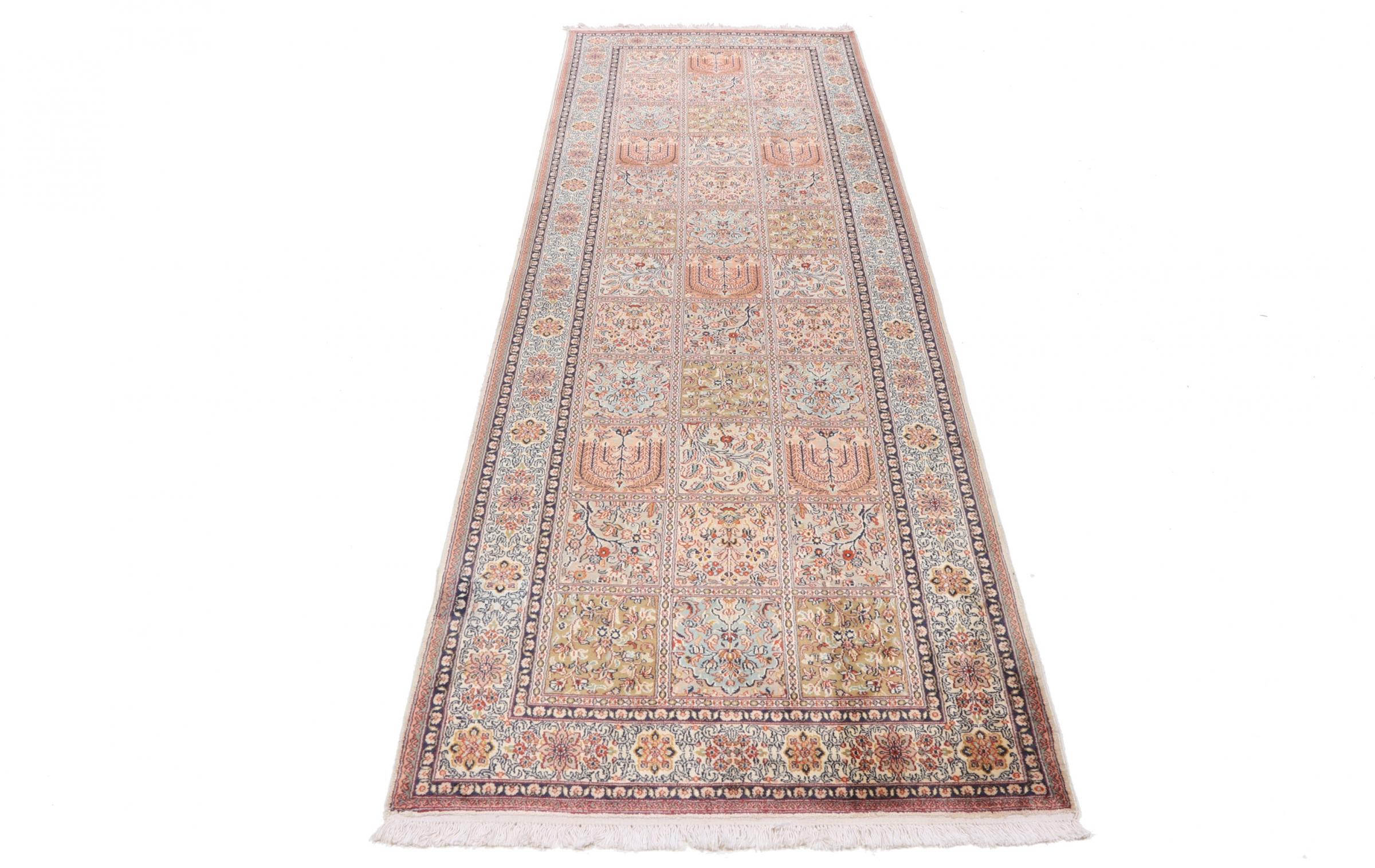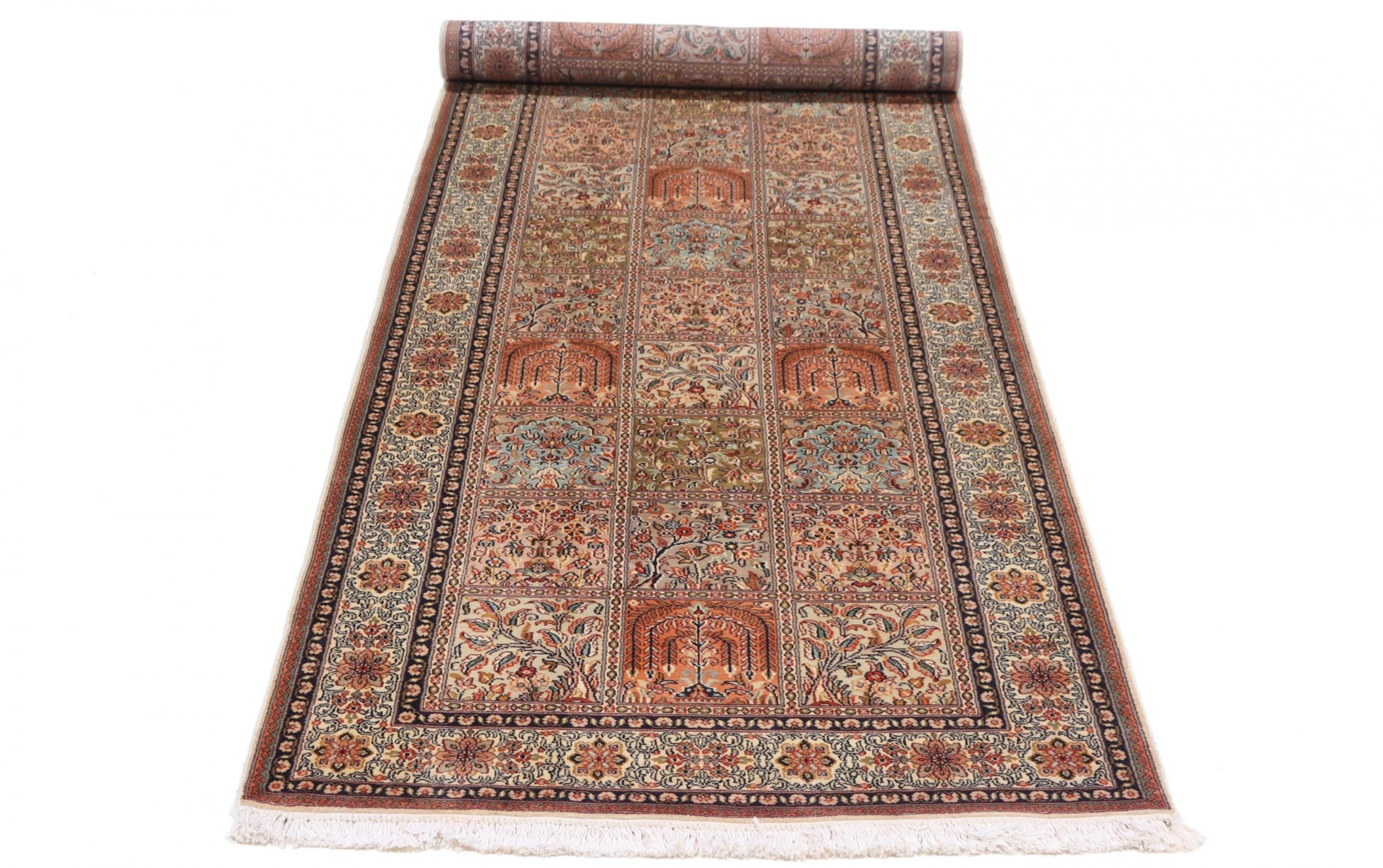 Covor Nr.: 108742006291087 Mărime: 306x96 cm Grosime: cca. 4 mm Noduri: 450 000 - 500 000 / m² Prelucrare: Lucrate de mână Catifeaua: Mătase Urzeala: Bumbac Origine: India Vechime: Nou Greutate: cca. 6 kg În stoc: Unic - Doar 1 în stoc