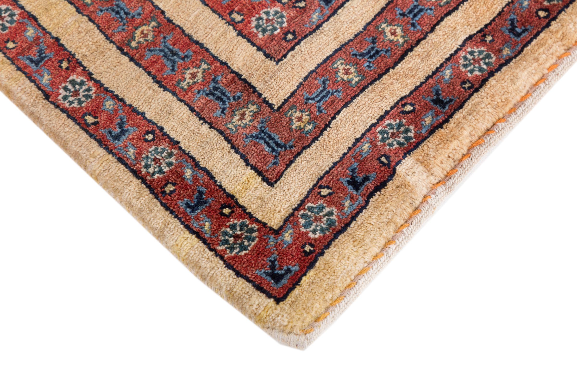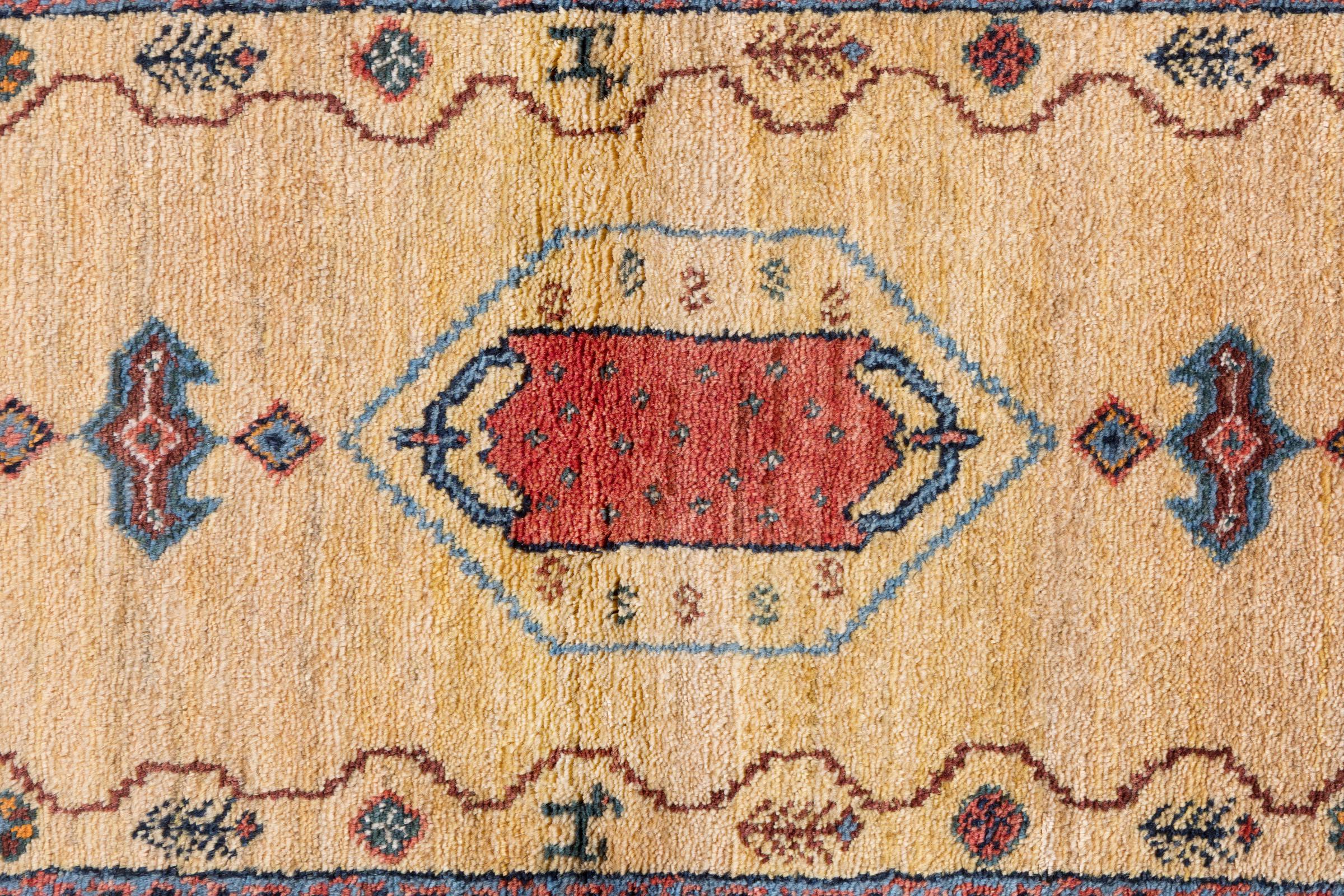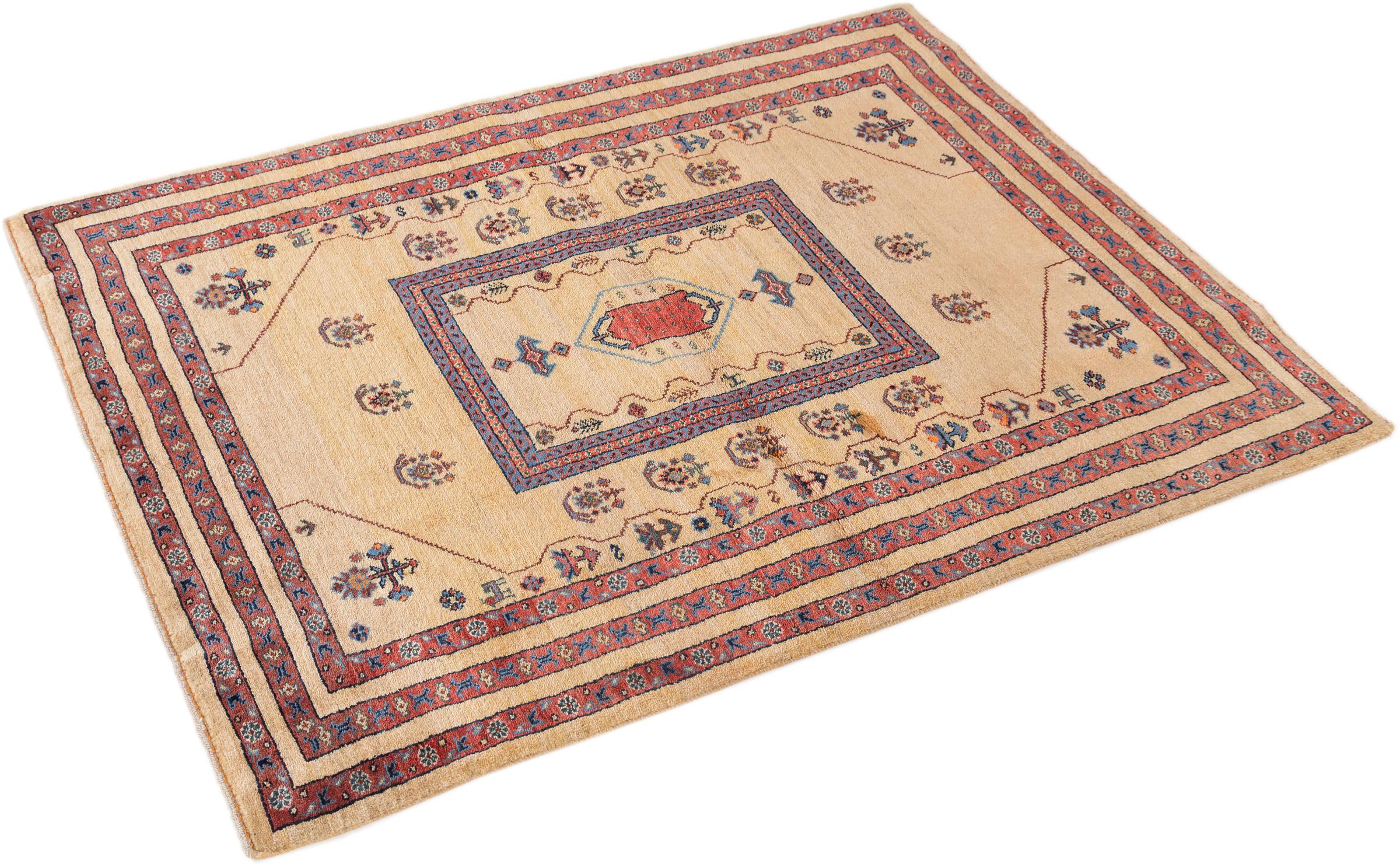 Acest frumos covor este un Gabbeh persan și este unul dintre covoarele Gabbeh de cea mai înaltă calitate. Covoarele sunt înnodate de nomazi sau semi-nomazi în Iran conform meșteșugurilor tradiționale. Motivele și modelele simple sunt în mare parte inspirate din mediul imediat al nomazilor. De exemplu, cămile, copaci sau tufișuri pot fi găsite pe covoarele tradiționale. Covoarele persane Gabbeh sunt fabricate din lână de la turmele de oi crescute local. Prin urmare, lâna este în mare parte toartă manual. Fiecare dintre aceste covoare orientale întruchipează un caracter unic al culturii de secole.