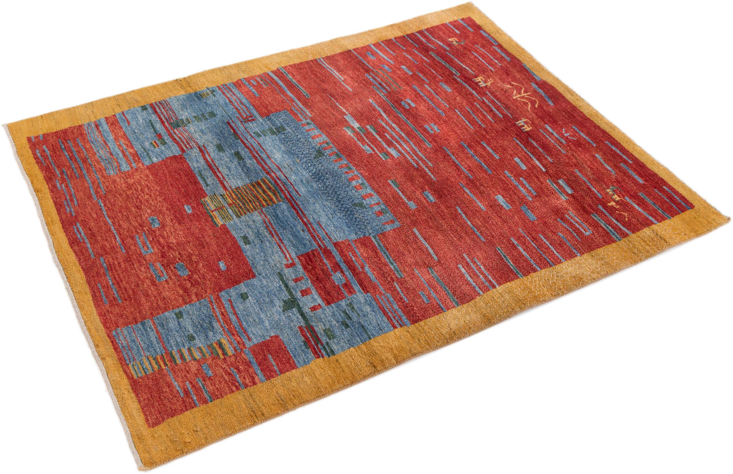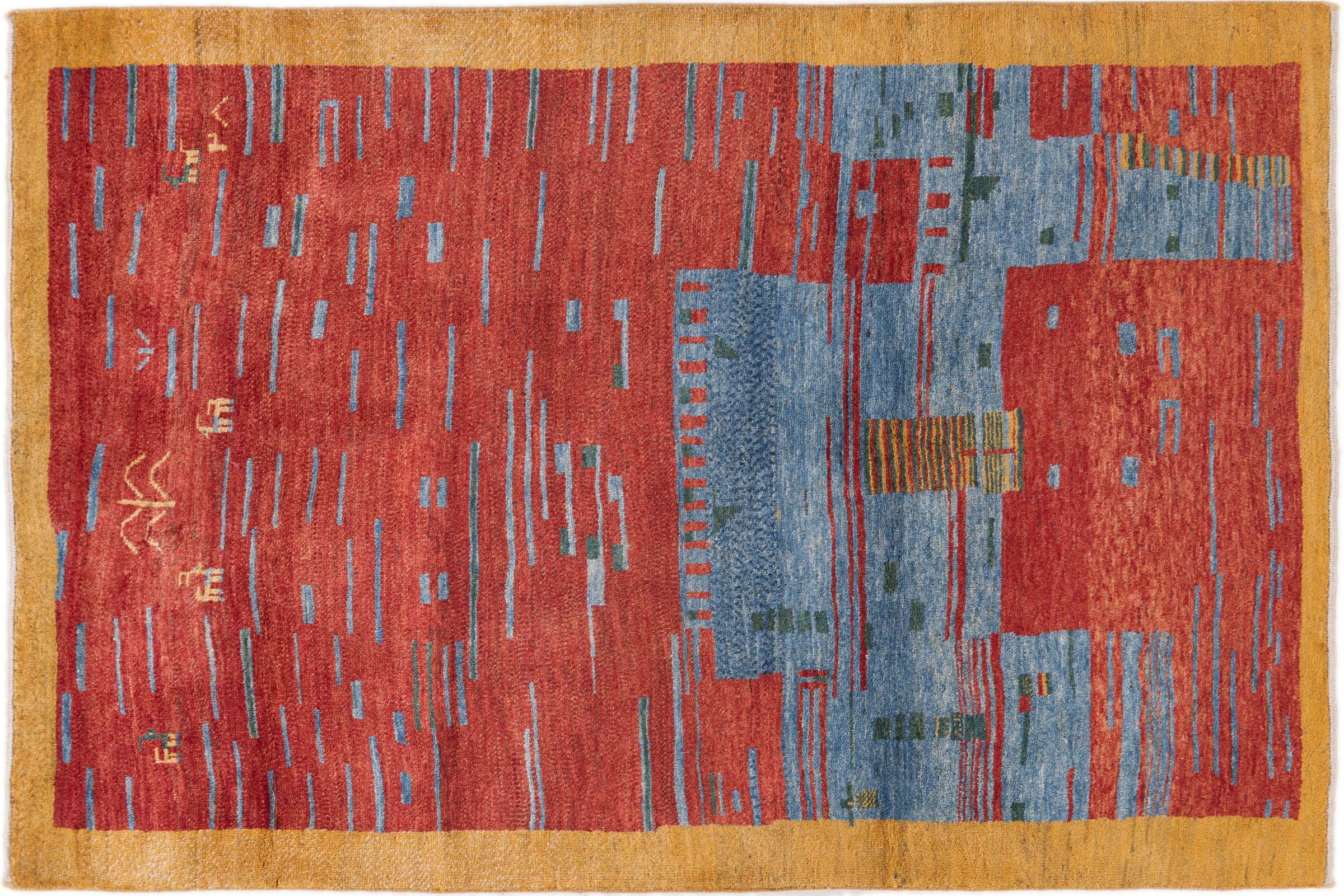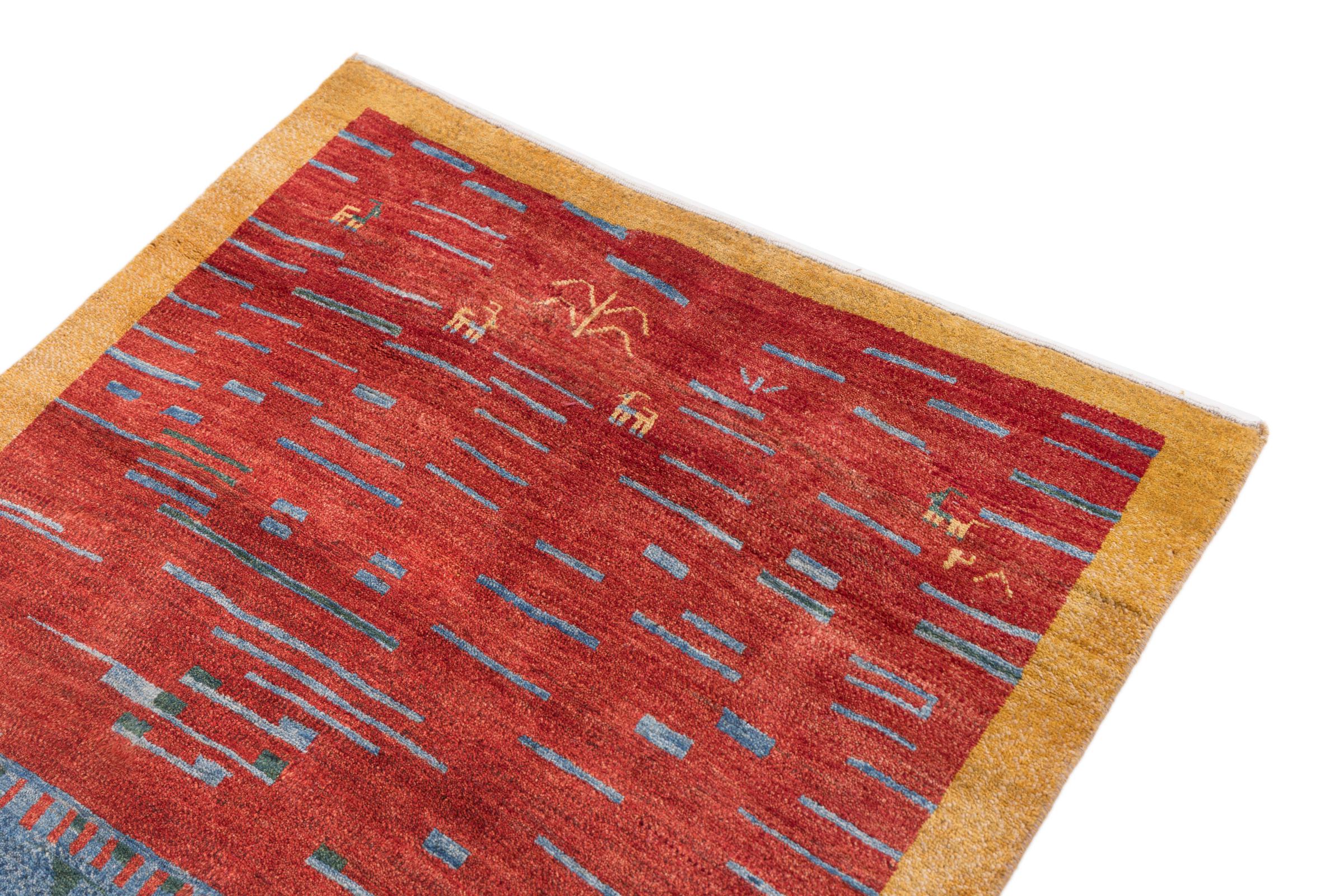 Acest frumos covor este un Gabbeh persan și este unul dintre covoarele Gabbeh de cea mai înaltă calitate. Covoarele sunt înnodate de nomazi sau semi-nomazi în Iran conform meșteșugurilor tradiționale. Motivele și modelele simple sunt în mare parte inspirate din mediul imediat al nomazilor. De exemplu, cămile, copaci sau tufișuri pot fi găsite pe covoarele tradiționale. Covoarele persane Gabbeh sunt fabricate din lână de la turmele de oi crescute local. Prin urmare, lâna este în mare parte toartă manual. Fiecare dintre aceste covoare orientale întruchipează un caracter unic al culturii de secole.