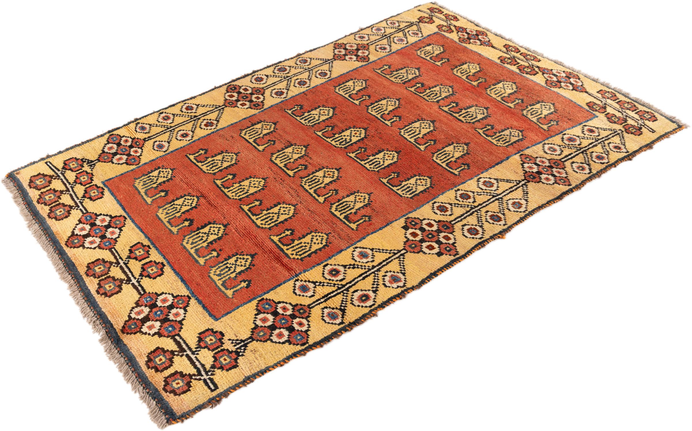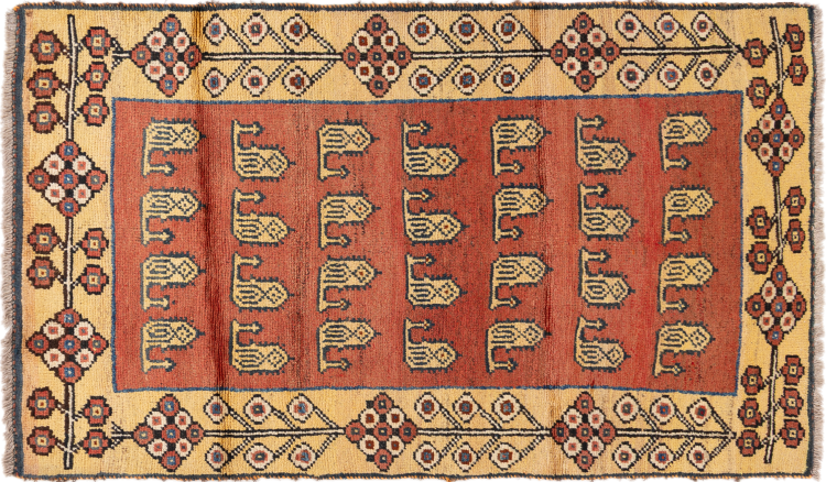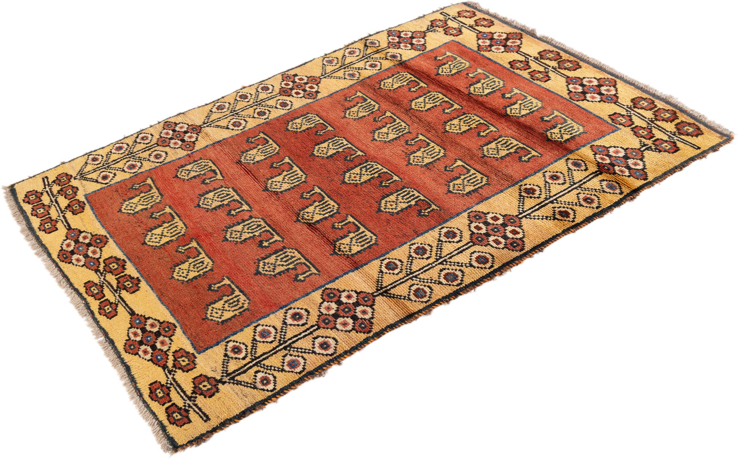 Acest frumos covor este un Gabbeh persan și este unul dintre covoarele Gabbeh de cea mai înaltă calitate. Covoarele sunt înnodate de nomazi sau semi-nomazi în Iran conform meșteșugurilor tradiționale. Motivele și modelele simple sunt în mare parte inspirate din mediul imediat al nomazilor. De exemplu, cămile, copaci sau tufișuri pot fi găsite pe covoarele tradiționale. Covoarele persane Gabbeh sunt fabricate din lână de la turmele de oi crescute local. Prin urmare, lâna este în mare parte toartă manual. Fiecare dintre aceste covoare orientale întruchipează un caracter unic al culturii de secole.