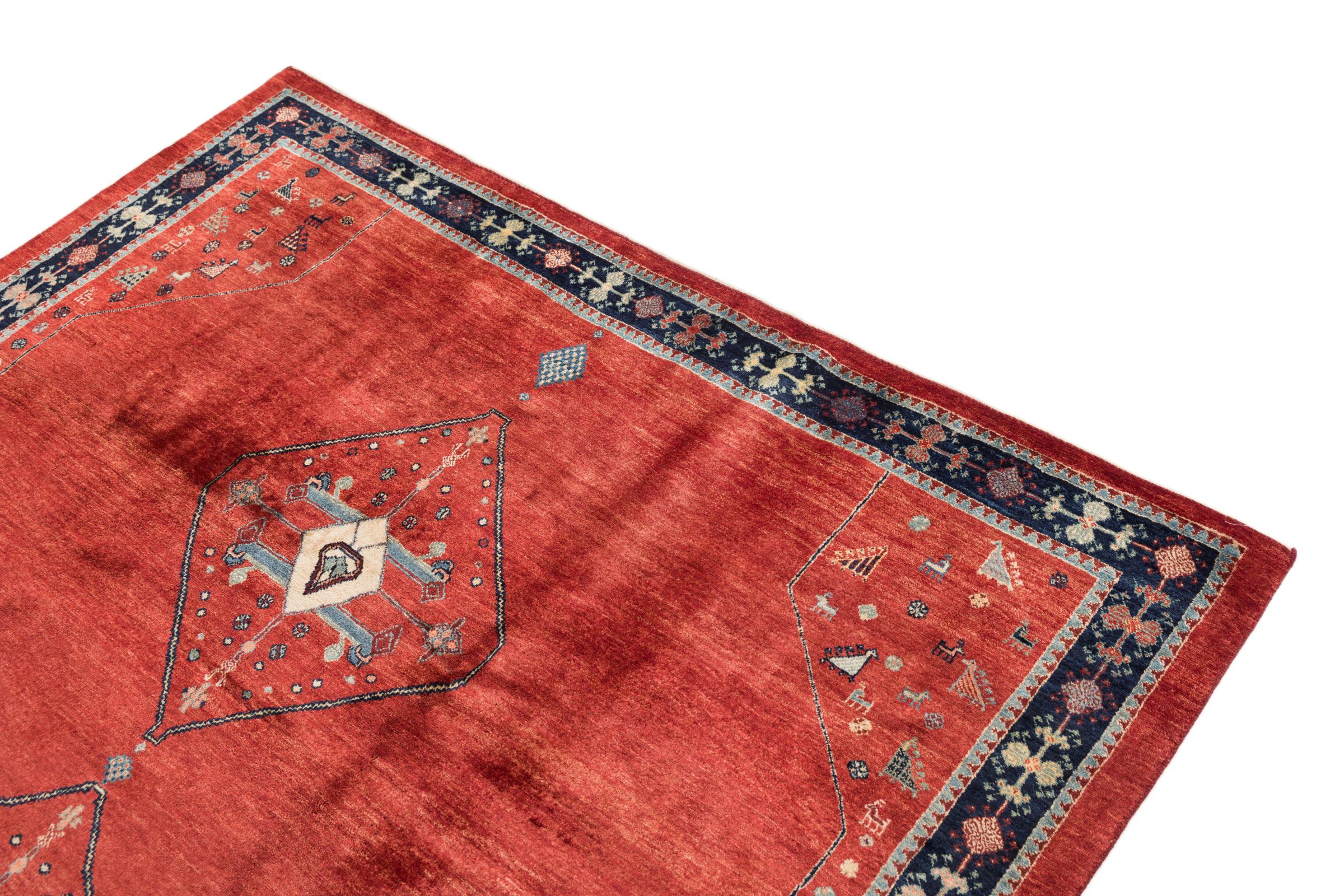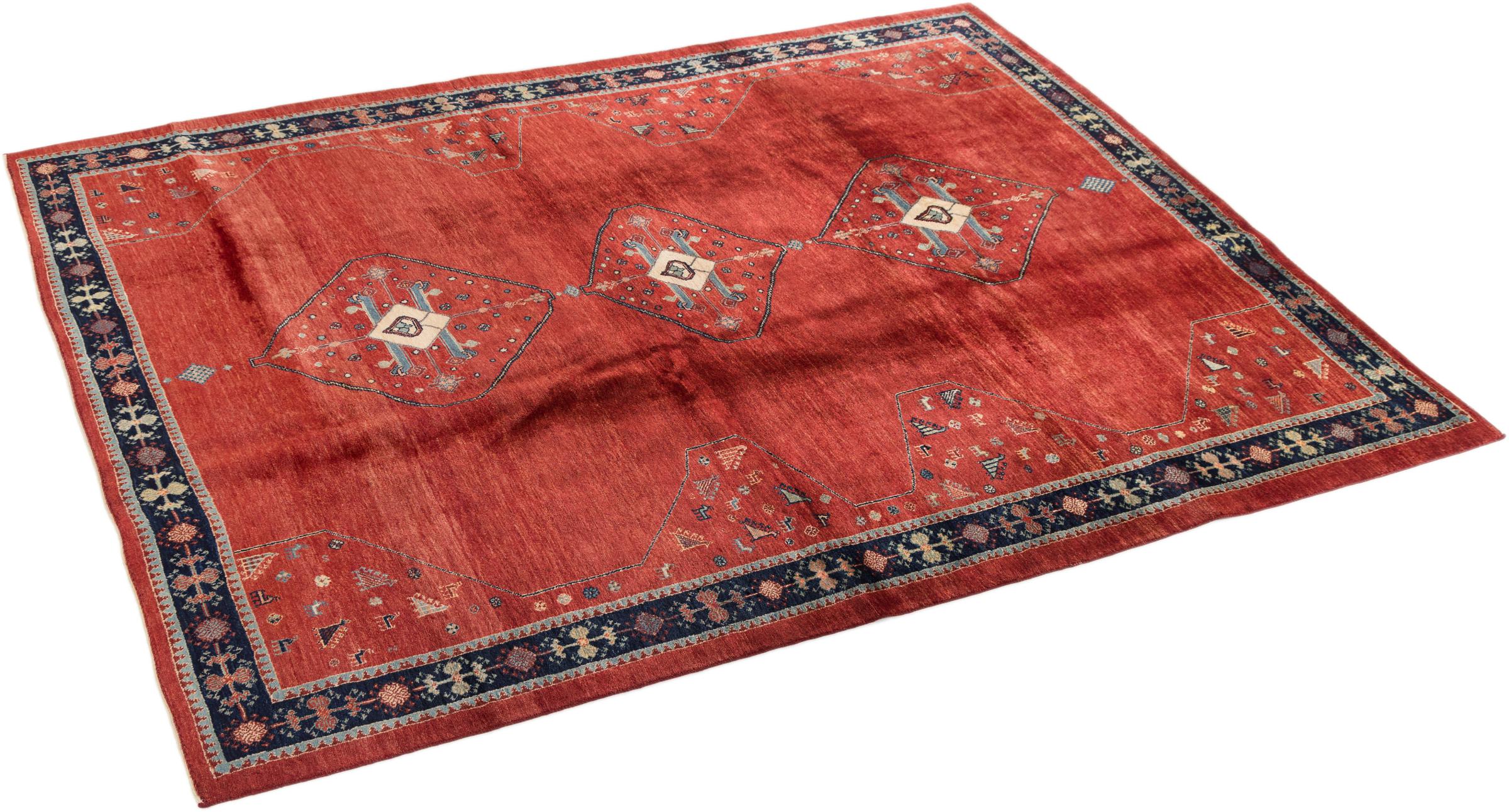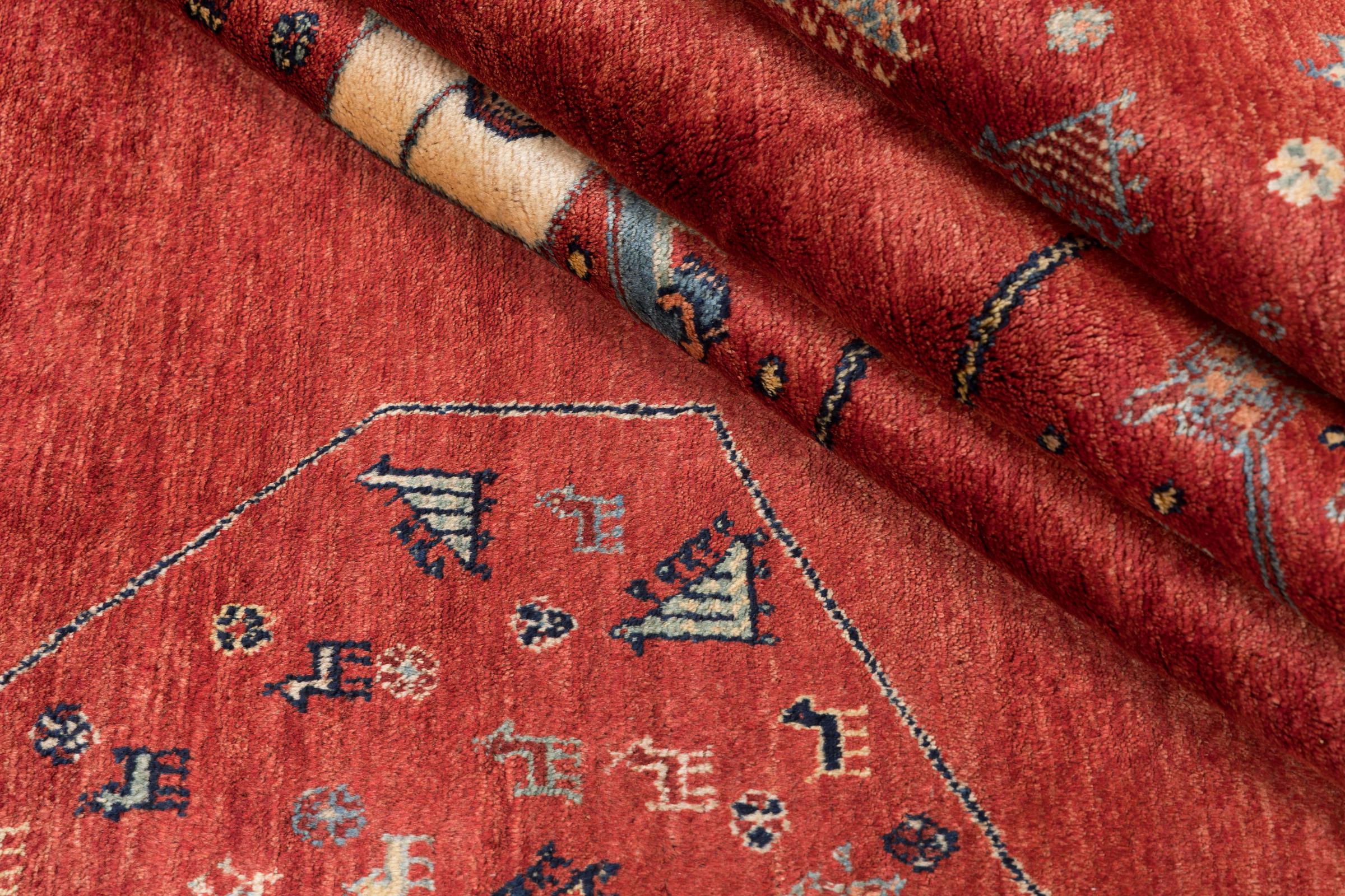 Acest frumos covor este un Gabbeh persan și este unul dintre covoarele Gabbeh de cea mai înaltă calitate. Covoarele sunt înnodate de nomazi sau semi-nomazi în Iran conform meșteșugurilor tradiționale. Motivele și modelele simple sunt în mare parte inspirate din mediul imediat al nomazilor. De exemplu, cămile, copaci sau tufișuri pot fi găsite pe covoarele tradiționale. Covoarele persane Gabbeh sunt fabricate din lână de la turmele de oi crescute local. Prin urmare, lâna este în mare parte toartă manual. Fiecare dintre aceste covoare orientale întruchipează un caracter unic al culturii de secole.