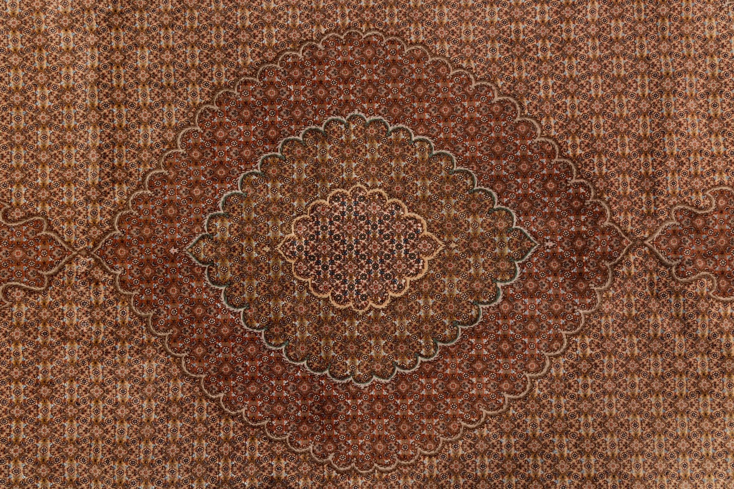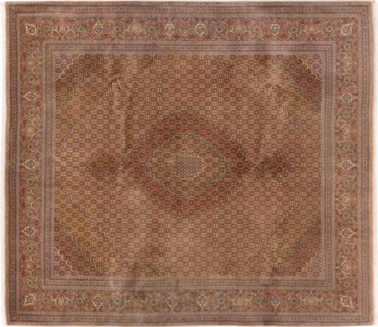 Covor Nr.: 30700700105537 Mărime: 344x299 cm Grosime: cca. 8 mm Noduri: 440 000 - 490 000 / m² Prelucrare: Lucrate de mână Catifeaua: Lână cu mătase Urzeala: Bumbac Origine: Persien / Iran Vechime: Nou Greutate: cca. 31 kg De asemenea cunoscut ca si Tabriz, Tabris, Täbris, Tebriz, Tebris, 40Raj, 50Raj În stoc: Unic - Doar 1 în stoc