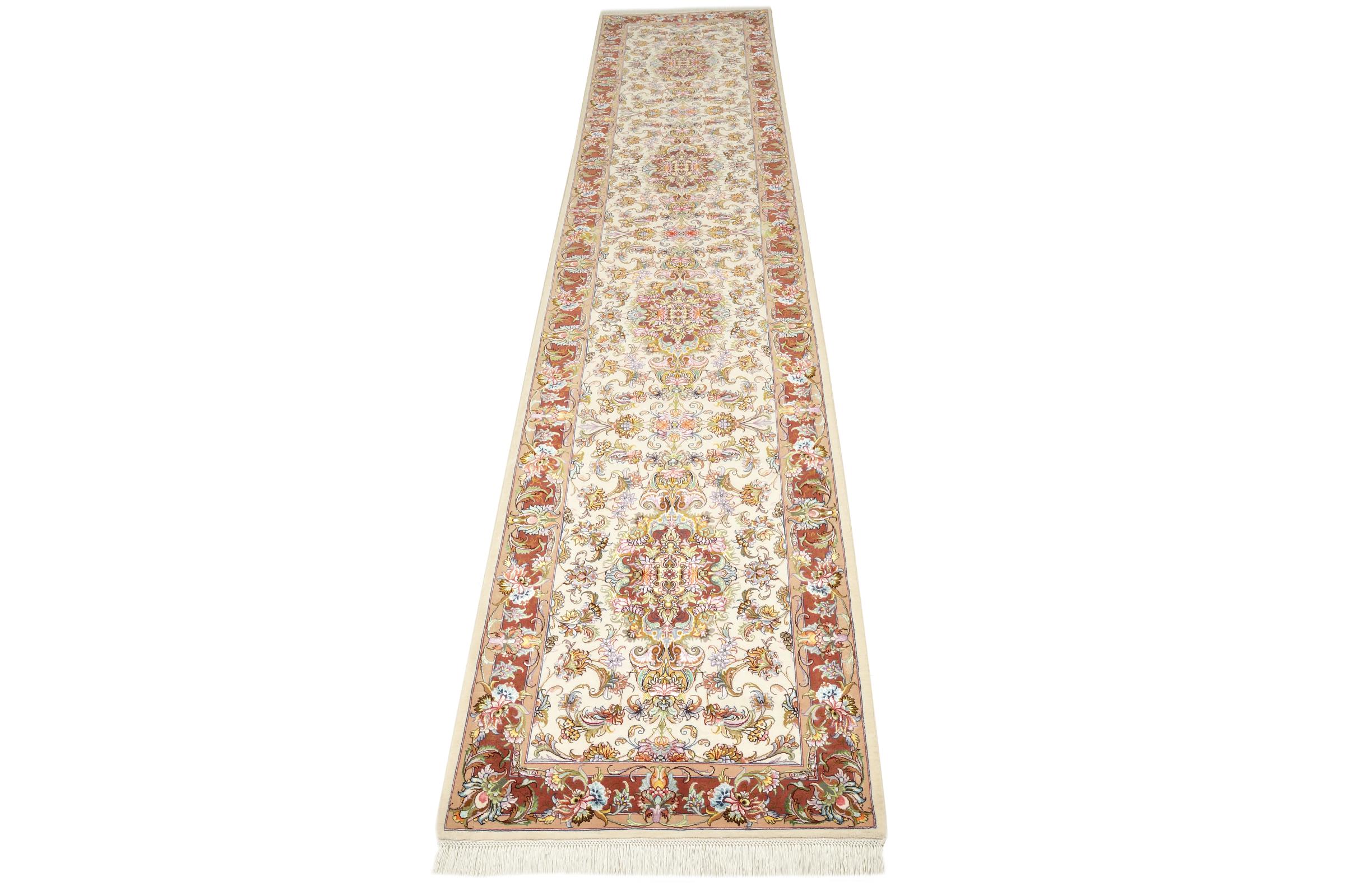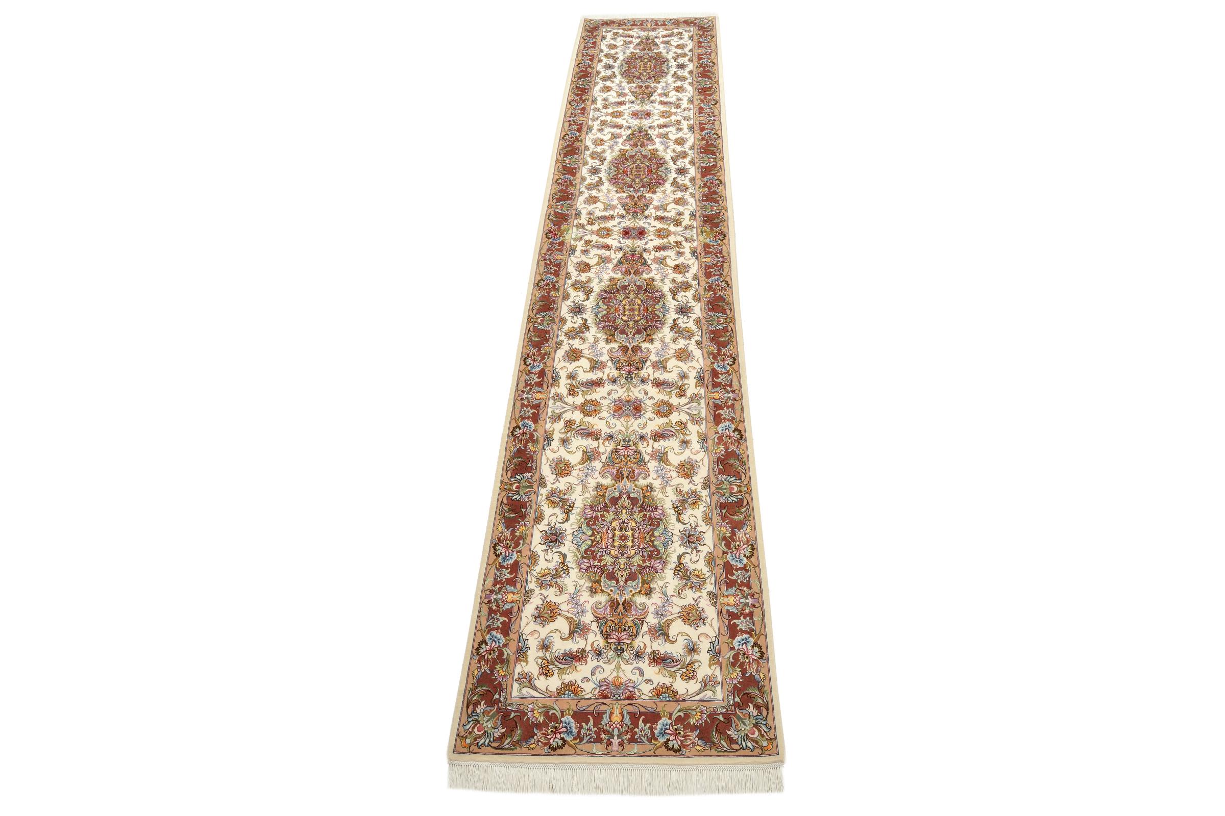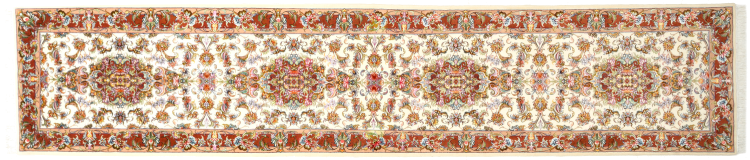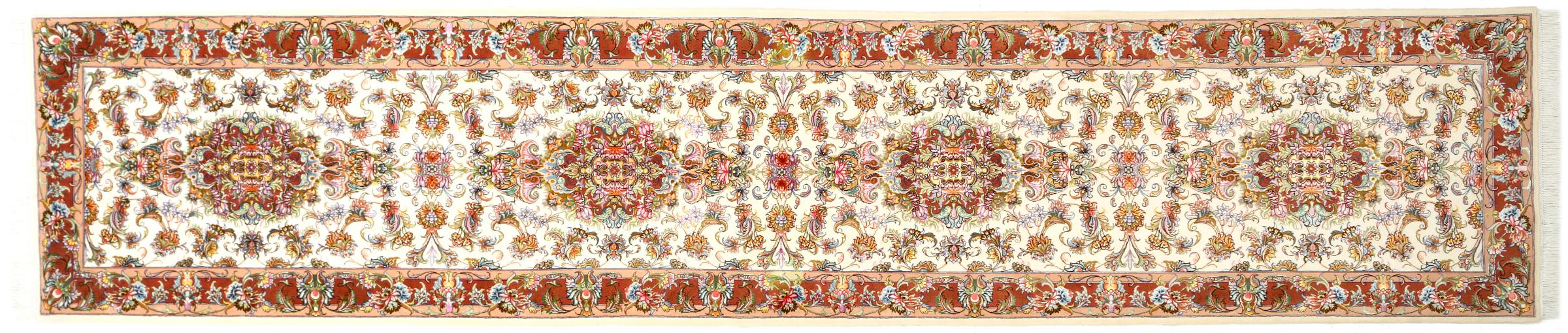 Covor Nr.: 193778009412039 Mărime: 424x84 cm Grosime: cca. 7 mm Noduri: 440 000 - 490 000 / m² Prelucrare: Lucrate de mână Catifeaua: Lână cu mătase Urzeala: Bumbac Origine: Persien / Iran Vechime: Nou Greutate: cca. 11 kg De asemenea cunoscut ca si Tabriz, Tabris, Täbris, Tebriz, Tebris, 40Raj, 50Raj În stoc: Unic - Doar 1 în stoc